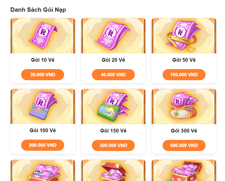 - Thiên Mệnh Nhân dùng Vé Nạp để mua các gói Ingame