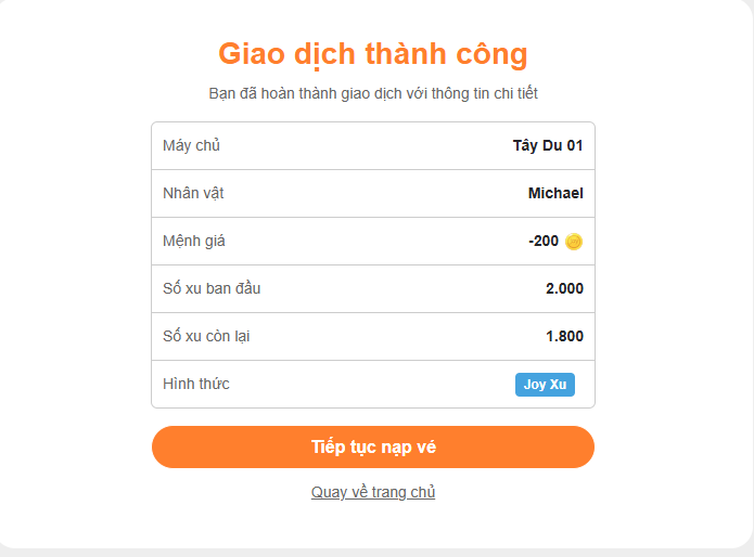 - Sau khi chọn gói và thanh toán xong. Hệ thống sẽ tự động chuyển Vé Nạp về đúng nhân vật và máy chủ đã chọn trước đó.