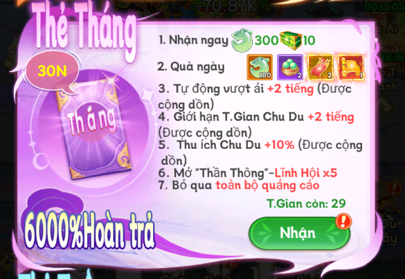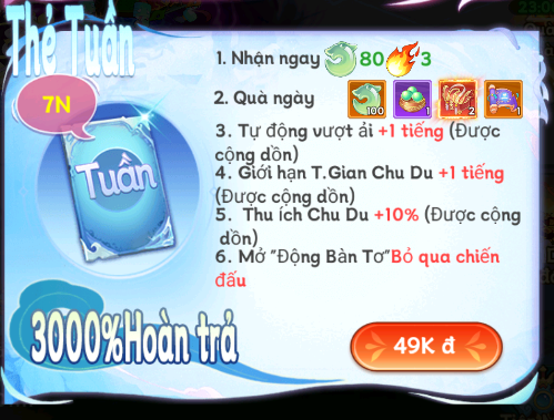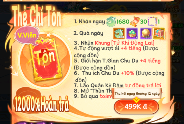 Đối với những dòng Game APK, việc nhận tài nguyên Offline là rất quan trọng. Thượng Tiên có thể đầu tư 3 loại đặc quyền: Chí Tôn, Thẻ Tháng, Thẻ Tuần với lợi ích như: