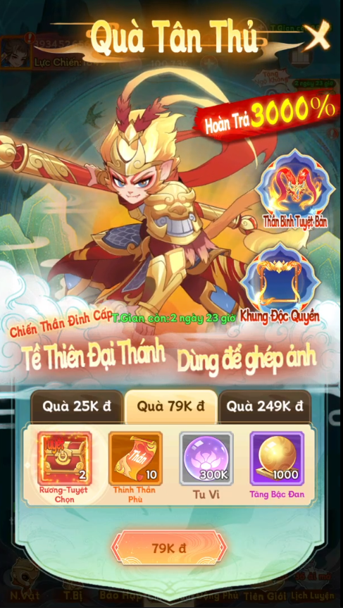 Quà nạp đầu là quà mà gần như các Thượng Tiên không thể thiếu vì với giá trị bỏ ra rất nhỏ nhưng nhận về rất nhiều tài nguyên quan trọng. Với 10 vé nạp tương tương 20.000, các Thượng Tiên sẽ sở hữu ngay Tuyệt Tướng Ngộ Không - Hỗ trợ rất tốt cho việc Clear phó bản và nhận Khung độc quyền trông cực ngầu