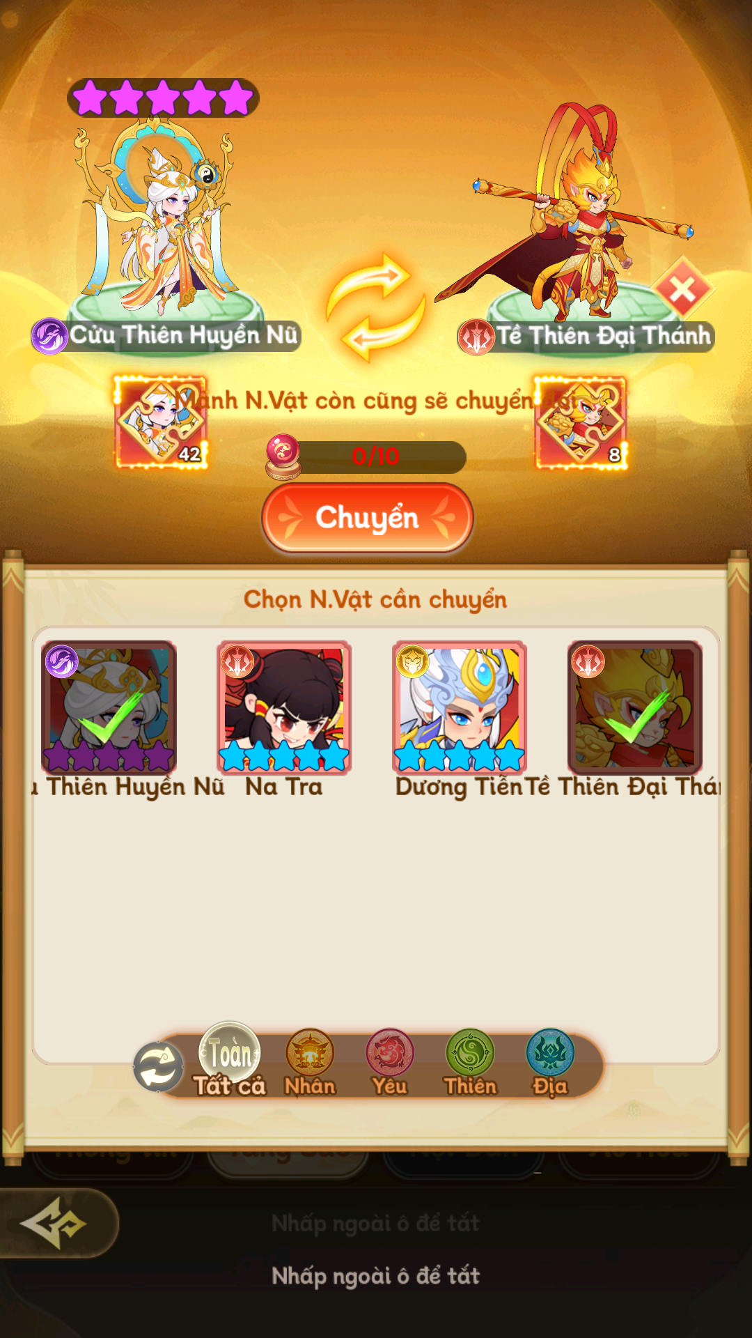 Khi tướng đạt tới cấp độ 5 sao Tím. Các Thượng Tiên có thể dùng "Chuyển Tinh Đan" - Vật phẩm mua tại Shop, Tiên Minh để hoán đổi cấp với 1 tướng khác