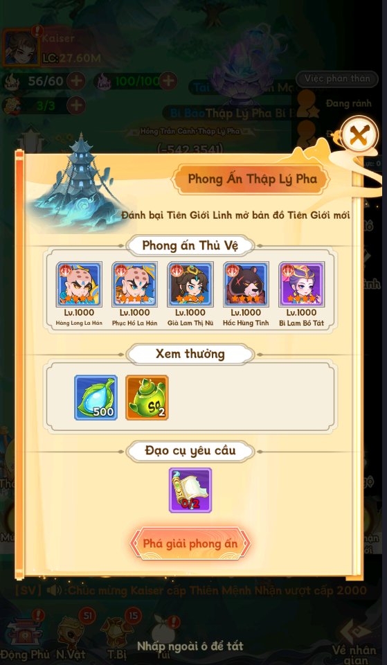- Hoàn thành hết nhiệm vụ của bản đồ Tiên Giới để nhận thưởng mốc, phá vỡ phong ấn sẽ có thể tiến sang bản đồ Tiên Giới tiếp theo